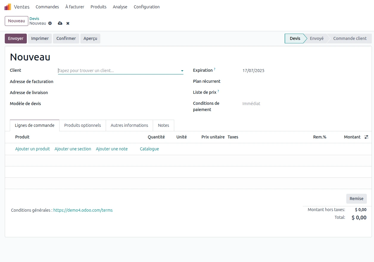 La création de devis est la première étape essentielle du processus commercial dans Odoo.