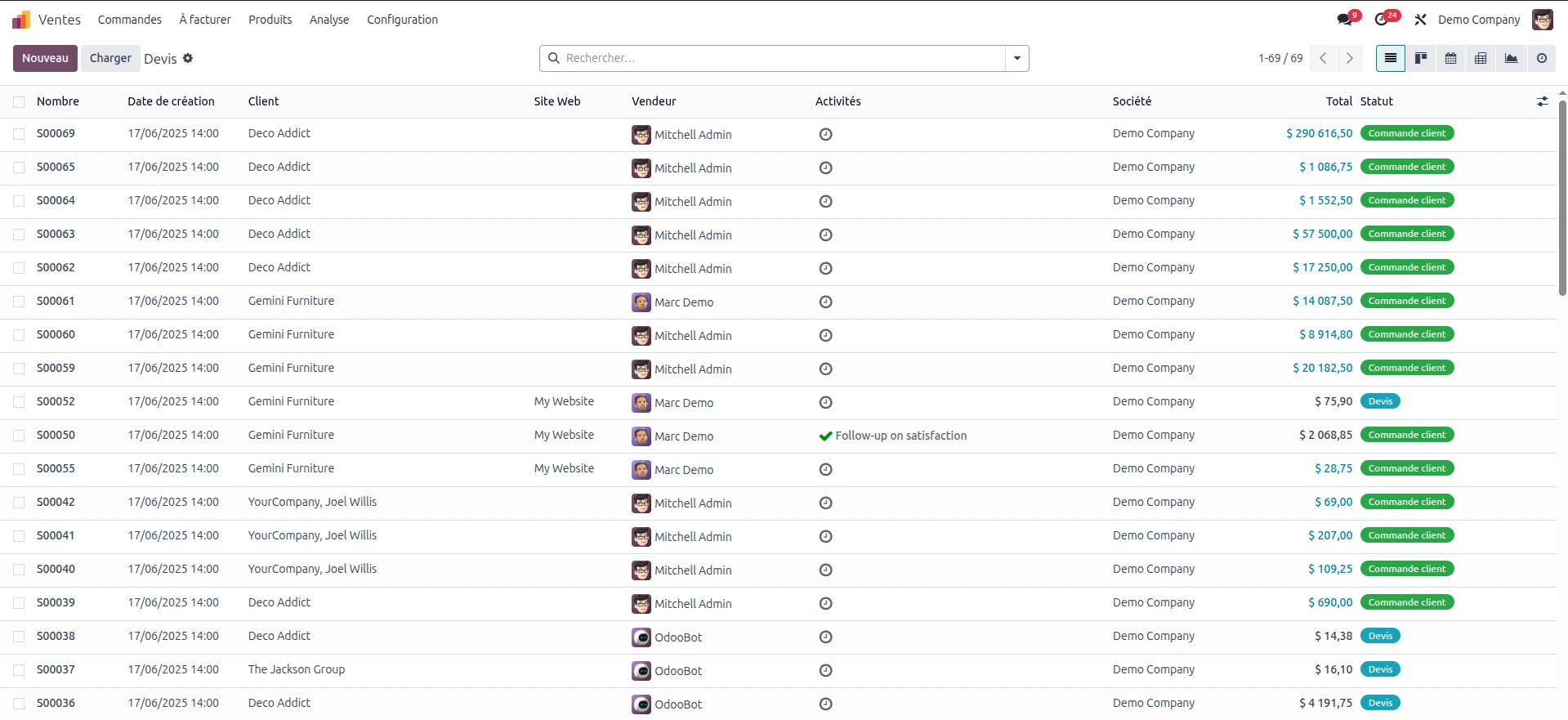 Lorsque vous ouvrez le module Ventes, vous arrivez par défaut sur la vue listant les devis et commandes existants.