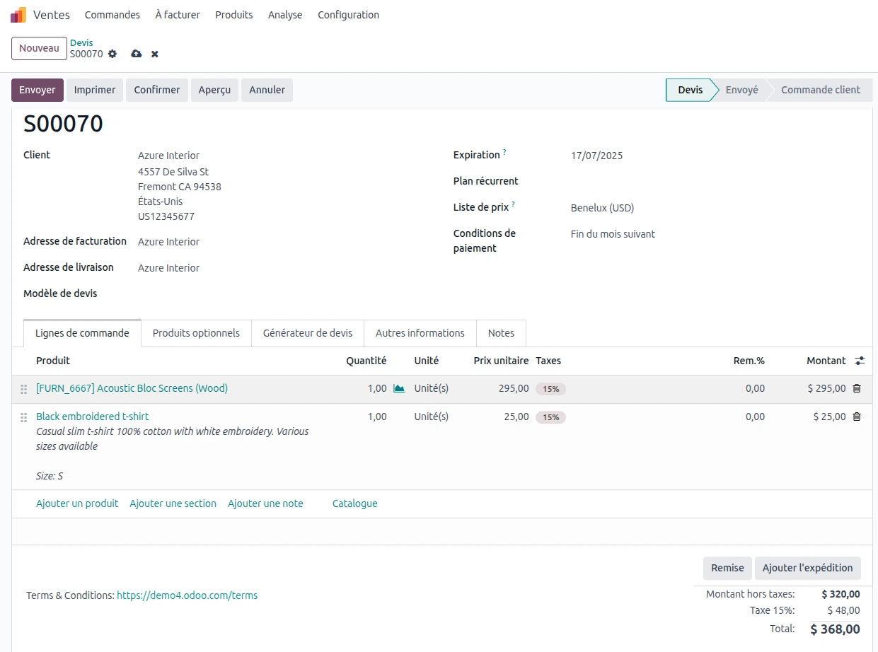 Avec le module Ventes Odoo bien configuré :